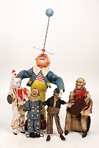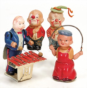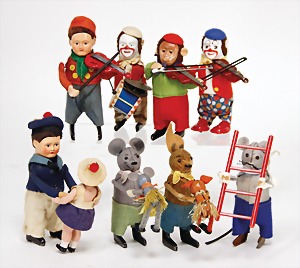 Konv. Tanzfiguren, Hase mit Kind, bespielt, Uhrwerk intakt, Clown mit Geige, Uhrwerk intakt, sehr guter Zust., Maus mit Kind, Uhrwerk intakt, guter Zust., Trachtenfigur mit Geige, bespielt - guter Zust., Uhrwerk intakt, Affe mit Geige, Uhrwerk intakt, guter Zust., Matrosenpaar, bespielt, Uhrwerk intakt, Maus, Arme lose, Uhrwerk intakt, 1 Clown mit Trommel, Uhrwerk defekt, sonst gut
