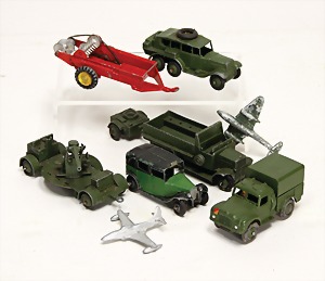 8-tlg., Militär, 1:43, 1x Taxi, 1x Kartoffelsortierer, 2 kl. Flugzeuge, guter Zust. - bespielt, teilw. Lackfehler
