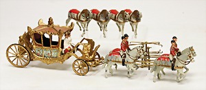 Königskutsche mit Königspaar, Zinnkomposition, Kutsche ohne Pferde: 18 cm, mit 8 Zugpferden, kl. altersbed. Lackfehler, sonst guter Zust., ausgefallen
