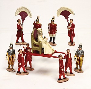 Vatikan-Szene, Metallguss, 6 cm Figuren, 2x Schweizer Garde, einige Garde-Figuren, Papst mit Sänfte, mit 4 Trägern, guter Zust., mit kl. altersbed. Lackfehlern, Lackfehler im Gesicht des Papstes