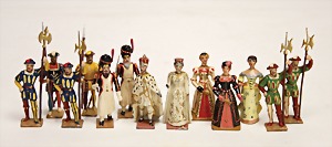 Kompositionsfiguren, 13-tlg., Zinn, plastisch, 5,5 cm, höfische Szene, Königsfamilie, Gardefiguren, meist guter Zust.