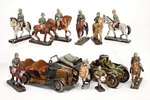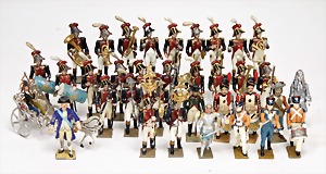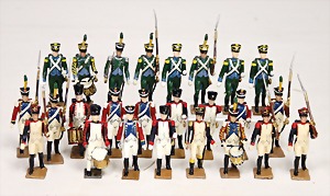 Kompositionsfiguren, 25-tlg., Zinn, vollplastisch, 9 cm, 4 Trommler, einige Figuren mit Gewehr über der Schulter, ein paar Gewehre fehlen, teilw. Gesichter unbemalt