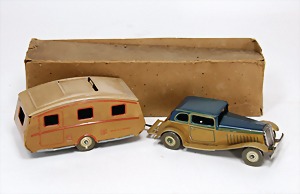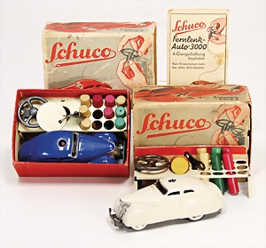 Nachkrieg, 2x Fernlenkautos, beige u. blau, blau guter Zust., Uhrwerk intakt, mit Zubehör u. Anleitung, Draht fehlt, Kart. etwas verschlissen, kl. Kratzer, Uhrwerk intakt, Orig.-Kart., Außenhülle eingerissen, etwas verschlissen