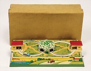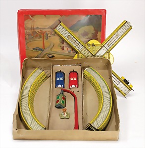 Autobahn, guter Zust., mit 2 Autos, Lack altersbed. verschlissen, Uhrwerk intakt, im Orig.-Kart., Ränder getaped