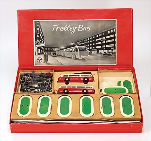 Esslinger Elektro-Spielwaren, Trolley-Bus, im Orig.-Kart., Anleitung im Deckel, Mechanik nicht geprüft, Rahmen der beiden Busse altersbed. verzogen