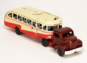 LKW-Busanhänger, ca. 1950, Made in US-Zone Germany, Uhrwerkantrieb, 29 cm, Kratzer am Dach des Anhängers, sonst gut