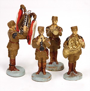 Zinn-Kompositionsfiguren, 31-tlg., plastisch, 9 cm, Musiker, Fahnenträger, dazu 3 Figuren Mittelalter, 1 Wagen Zinn lackiert, flach