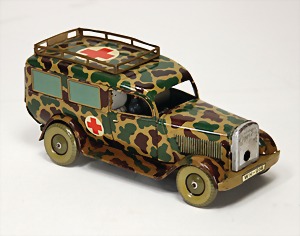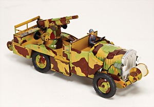 LKW mit Flak-Geschütz, 2. Weltkrieg, Blech, Mimikry, lithogr., 35 cm, Uhrwerk klemmt, elektr. beleuchtete Frontscheinwerfer, Lackfehler an den Sitzen, sonst Lackierung gut