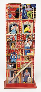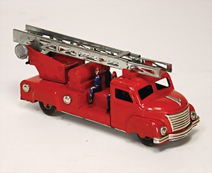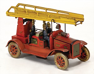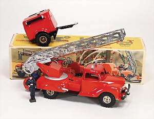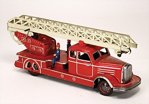 260/9, Feuerwehr-Leiterwagen, Leiter nicht kompl., 1 Ecke ausgehängt, Uhrwerk intakt, mit Glocke, 23,5 cm, guter Zust., im Orig.-Kart.
