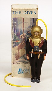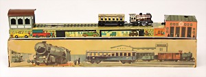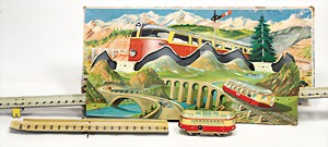 Mountain-Express, Blech lithogr., Uhrwerk intakt, Spielspuren am Fahrzeug, sonst guter - sehr guter Zust., im Orig.-Kart, Kart. altersbed. verschlissen