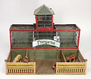 "Thiergarten", Manufakturarbeit, Blech handlackiert, um 1900, B: 51 cm, T: 35,5 cm, H: 41 cm, Draht an den Gehegen verbogen, altersbed. Lackfehler, unberührter Dachbodenfund, Masse-Eule orig., andere Tierfiguren später