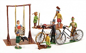 Konv. Zinkguss-Figuren, spielende Kinder, Schaukel, 2 Fahrradfahrer, vollplastisch, 15 cm