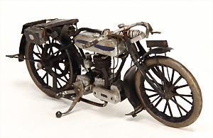 Motorrad, Modell, Blech u. Holzteile, filigran gearbeitet, ein paar Kleinteile lose, 22 cm, wohl 20/30er Jahre