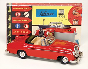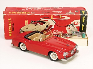Mercedes, 190 SL, 2095, 21 cm, Blech, kl. Druckstelle auf der Motorhaube, sonst guter Zust., Uhrwerk intakt, im Orig.-Kart. mit Zubehör