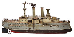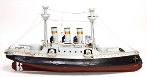 Schlachtschiff, handlackiert, ca. 1920, Lackierung orig.?, Hersteller oder Eigenbau?, Uhrwerk intakt, stattliche Größe, 1 Rettungsboot fehlt, 84 cm, ein paar Lötstellen lose