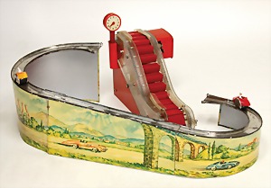 gem. SG im Kreis, Rennbahn, Blech, mit Kunststoff-Förderband, Fahrzeuge, 1x gebrochen, 1x mit Klebestelle, kl. Fehlstellen an den Kunststoffteilen, Uhrwerk intakt, sonst gut, bitte besichtigen