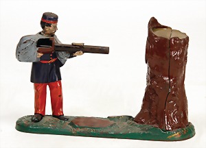Money-Box, USA, Mann auf Baum schießend, Eisenguss lackiert, ohne Schlüssel, kl. Lackfehler, sonst gut