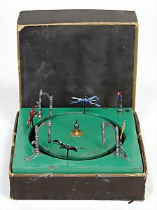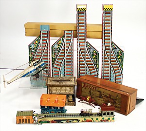 Konv. Blechspielzeug, Wendebahn, Blech lithogr., nicht komplett, Arnold, Wendebahn, Lagerungsspuren, im Orig.-Kart., Uhrwerk defekt, Helibus, Hubschrauber, Ersatzteilspender, 1 Pferderennspiel, ca. 1920 mit Zinnreitern, Ascot, 3 Reiter, Köpfe weggebrochen, dazu kl. Xylophon, 14 cm