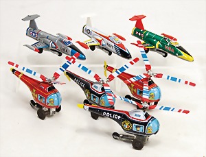 Lagerfund, 4 Hubschrauber, 3 Flugzeuge, Jets, Blech lithogr., Japan, 12/13 cm, Friktionsantrieb