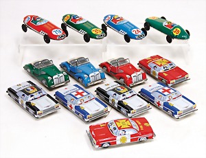 Lagerfund, Fahrzeuge, 4 Rennwagen, 6 Polizei-, Ambulanz- und Feuerwehrautos, 3 Fahrzeuge, Japan, Friktionsantrieb, Blech lithogr., 10,5/12 cm, neuw.