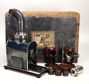 herrschaftl. Laterna-Magica, frühe Ausführung für Filmtechnik, Blech auf Holzsockel montiert, L: 30 cm, Orig.-Holzkiste mit Filmen und Zubehör, 56x38,5 cm, sehr schöner unberührter Orig.-Zust.