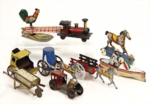 Konv. Pferd mit Wagen, Pferd mit Behälterwagen, Kutsche, kl. Rennboot, Italy, Rennwagen, kl. Dampflock, teilw. zum restaurieren, bitte besichtigen