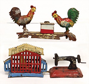 3-tlg., Vogelbauer, 1 kl. Klappe seitl. fehlt, pickende Hühner, Candy-Container, Flugrost, Mechanik klemmt, kl. Nähmaschine