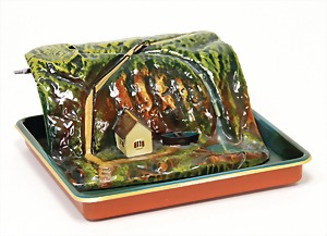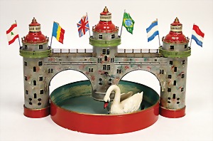 Wasserburg mit Schwanensee, um 1900, Blech, handlackiert, H: 29 cm, L: 50 cm, mit kreisendem Blech-Schwan, Uhrwerk intakt, kl. altersbed. Lackfehler, Orig.-Zust., dekorativ