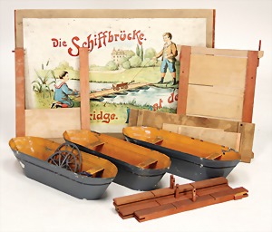 Die Schiffbrücke, Ponton Bridge, deutsch, um 1900, Orig,-Holzkasten mit 3 Blechbooten, handlackiert, dazu Holzteile, wohl weitgehend kompl., auf Vollständigkeit nicht geprüft, Orig.-Holzkiste mit bunt lithogr. Deckbild