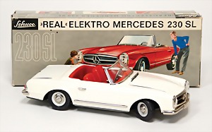Real Elektro Mercedes 230 SL Pagode 500, 26 cm, weiß, Batteriekasten etwas angerostet, im Orig.-Kart. mit Anleitung, 1 Frontscheinwerfer gebrochen, sonst guter – sehr guter Zust.