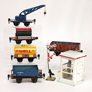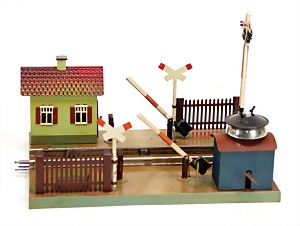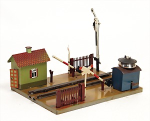 Spur 0, Bahnübergang mit Läutewerk, Signal und Bahnwärterhäuschen, Uhrwerk klemmt, sonst guter Zust.
