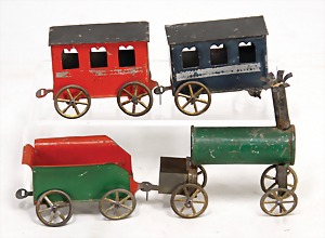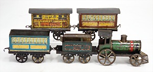 Bodenläufer, Blech lithogr., Storchbein Schlepptenderlok B mit Kuhfänger, 3 Personen-Wagen, ein Dach sowie ein Schornstein fehlen, Länge der Lokomotive 32 cm, altersbedingt Lackfehler, ca. 1890