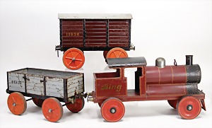 Bodenläufer, Tenderlok B, mit Kuhfänger, 1 off. und 1 geschl. Güterwagen, Länge der Lokomotive: 56 cm, Lackfehler, teilw. leichter Flugrost, Orig.-Zust.