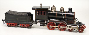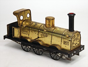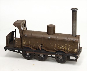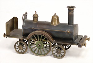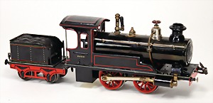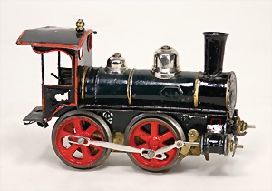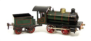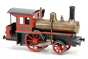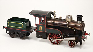 Storchbein-Tenderlok, Spur 1, 25 cm, Dampfantrieb, farbl. überarbeitet, mit Brenner, farbl. überarbeitet, mit Brenner, ca. 1890