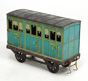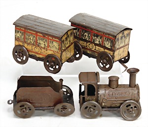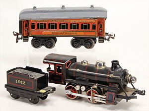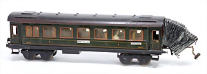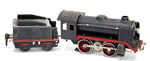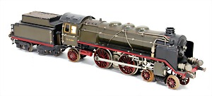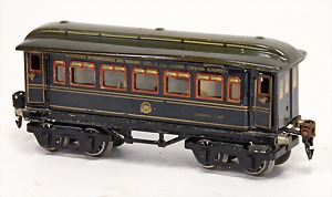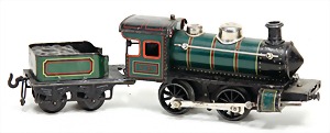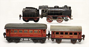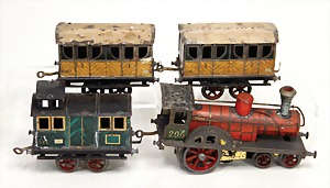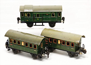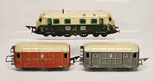 3 Tlg. Spur 0, Uralt, 2 Personenwagen, 1 Gepäckwagen, Lackfehler an den Dächern der Personenwagen, bespielt gut, dazu Schlepptenderlock 2a, nicht kompl., Tender fehlt, Gehäuse liegt lose bei, Uhrwerk defekt, schönes Teil zum Richten, früh