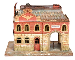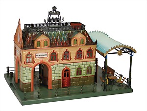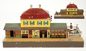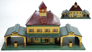 Zentralbahnhof, Uralt 2041, Blech handlackiert, Grundplatte 42x30 cm, H: 32 cm, Durchgang mit Kassenhäuschen, Wartesaal, seitl. Bahnhofsüberdachung, mit Bank und Bestuhlung, 3 Massefiguren, schöne Farben, Bodenplatte möglicherw. etwas ausgebessert, 1 Geländer-Teil fehlt, sonst guter Zust.