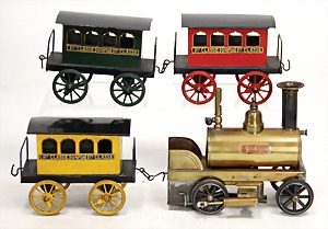 Tenderlok B, Messing, Dampfantrieb, Radabstand 6,5 cm, mit Brenner, 3 Personenwagen, ca. 1890, guter Zust.