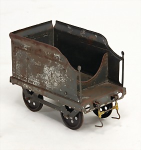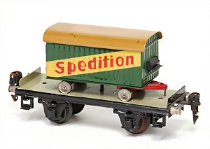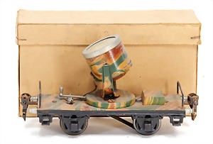 Spur 0, Güterwagen, mit Traktor, Blech handlackiert, 16,5 cm, Orig.-Ketten, altersbed. verzogen, Uhrwerk intakt, guter Zust. mit nur geringen Spielspuren