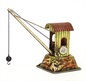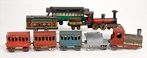 Fundkiste, Tenderlok 2b, mit Kuhfänger, 20 cm, Penny Toy, dazu 1 Personenwagen, 1 Zug, Penny Toy, 3 Personenwagen, Schlepptenderlok B, Achsen liegen teilw. lose bei, 1 Schwebebahn, Motorteil, deutsch, Vorkrieg, 1 Rad fehlt, Uhrwerk defekt