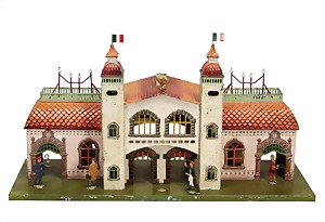 Zentralbahnhof, Blech handlackiert, Kräusellack-Lackierung, Fenster-Umrandungen lithogr., 59x20,5 cm, H: 30 cm, ca. 1920, Orig.-Zust., mit kl. altersbed. Lackfehlern, dazu 4 Zinnfiguren, schöner Orig.-Zust.