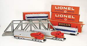 Konv. Spur 0, ca. 10 Wagen, Triebwagenzug, Santa Fe, 3-tlg., Zubehörteile, Signal, Gebäude, Prospektmaterial, meist neuw., im Orig.-Kart.