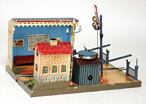 Bahnübergang, Uralt, m. Bahnsteigüberdachung, Bahnwärter-Häuschen, Signal Telegraph, Läutewerk, Grundplatte: B: 35 cm, passend für 0 u. 1, schöner Orig.-Zust. mit altersbed. Lackfehlern