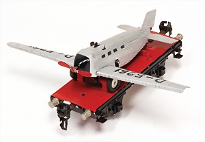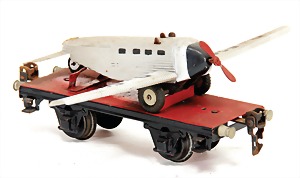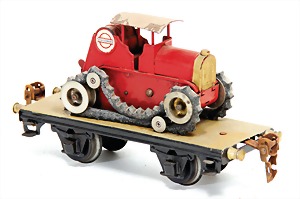 Spur 0, 1709, Plattformwagen mit Raupenschlepper, rot, Uhrwerk intakt, Ketten altersbed. gerissen und verformt, Lackfehler am Dach des Schleppers, sonst guter Zust.