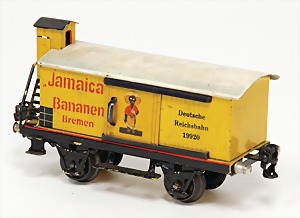 Spur 0, Kühlwagen mit Bremserhaus, Jamaica Bananen, 1992, leicht bespielt, Dach etwas verschmutzt