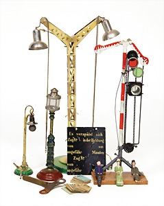 Konv. Märklin, Uralt, Doppelflügelsignal, H: 29,5 cm, bespielt gut, kl. Laterne, 19 cm, dazu 1 kl. Laterne Kibri, 1 Doppelflügellampe Kibri, stärker bespielt, 3 sitzende Figuren, 1 Schild 8x10 cm, schönes Konv.