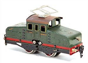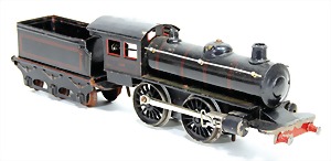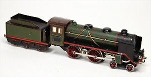 Spur 0, Schlepptenderlok 2B, elektr. Ausführung, 20 Volt, grün/schwarz, 39 cm, Lack stärkere Krakelee-Bildung, Tender gut, techn. nicht geprüft