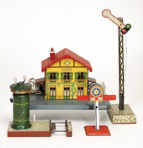 Konv. Eisenbahnen, Jep-Bahnhof, passend zu Spur 0, 1 Läutewerk, Märklin, Blech, handlackiert, altes Märklin-Zeichen, Uhrwerk intakt, Zuglaufschild mit Uhr, Signal, bespielt