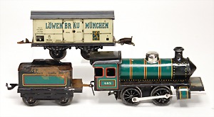 Spur 0, Schlepptenderlok B 585, Tender angerostet, dazu 1 Güterwagen: Löwenbräu, guter Zust. Griffe an den Türen fehlen