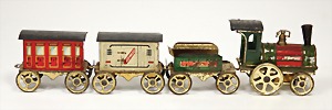 Bodenläufer, Schlepptenderlok B, 2 Personenwagen, Blech lithogr., vor 1900, Italy, Kupplung zwischen Lok und Tender fehlt, Radabstand 5 cm, altersbed. Lackfehler