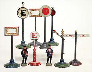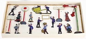 Eisenbahnfiguren, Zinn, ca. 1910, halbplastisch, 4,5-5 cm, mit Schildern und Signal, guter Zust., im Orig.-Kart.